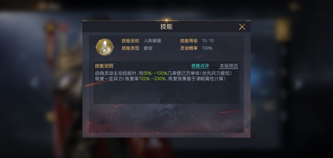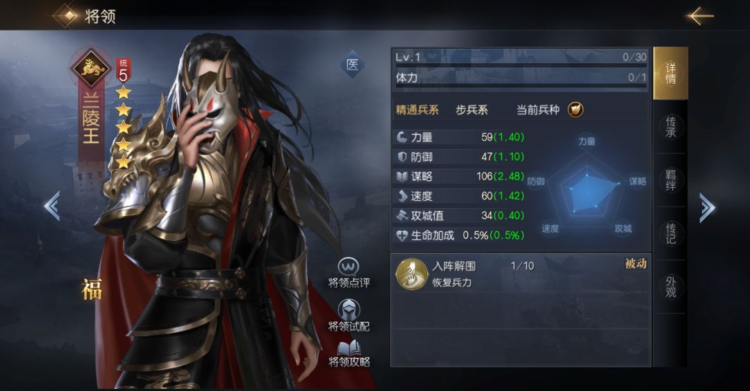 兰陵王虽然本身并不带有治疗能力,但他在释放主动技能时必定可为一名队友恢复兵力,这给予了他非常大的技能搭配空间,让他能在使用其他功能性/输出性技能时,都保有优秀的治疗能力。相比其他辅助类将领适应能力更强,几乎可搭配到任意阵容中使用。