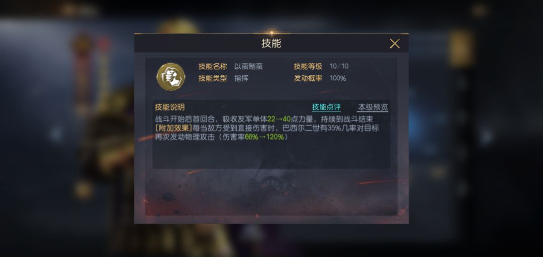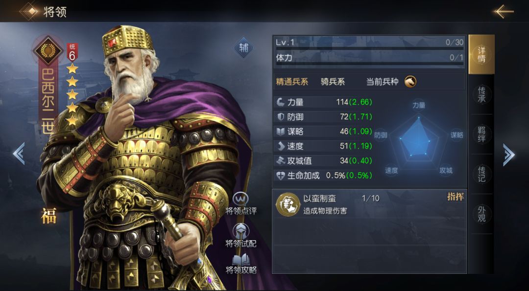 巴西尔二世虽然是6统将领,但他的技能可为其提供非常多的输出机会,并且触发伤害无需主动释放,对速度完全没有要求,简单搭配另一名核武(如吕布、本多忠胜等输出频率较高的将领)就能打造出双核阵容,或是为其搭配指挥型技能,只利用自带技能补充伤害也可以。