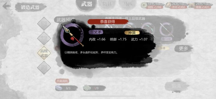 紫色武器好像都必带技能,打了三把武器都是,然而基础属性差距贼大,同样是三丈矛,一个只加1.57统御,被这个完爆。