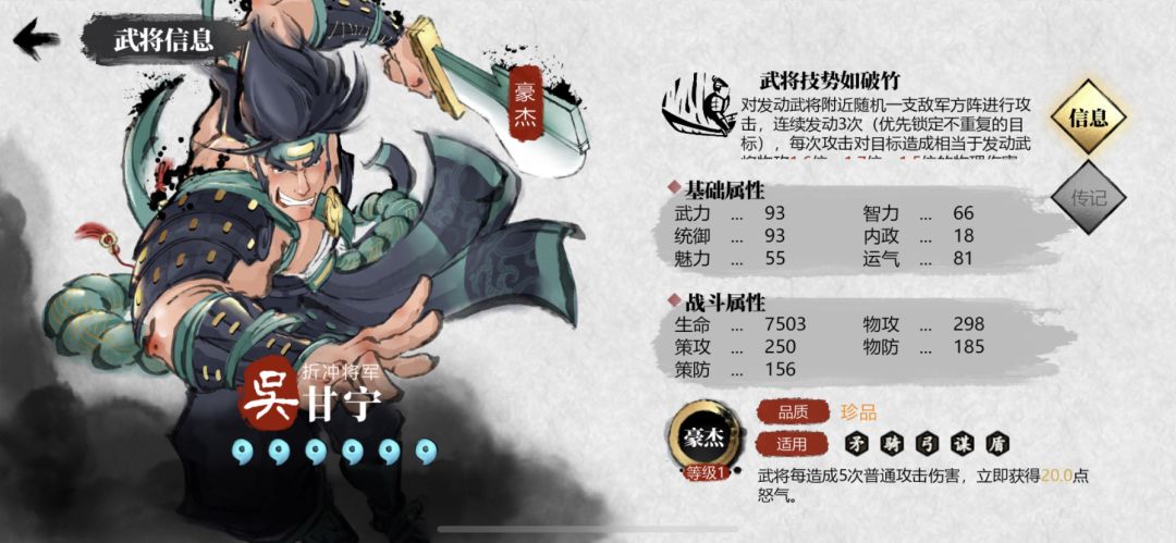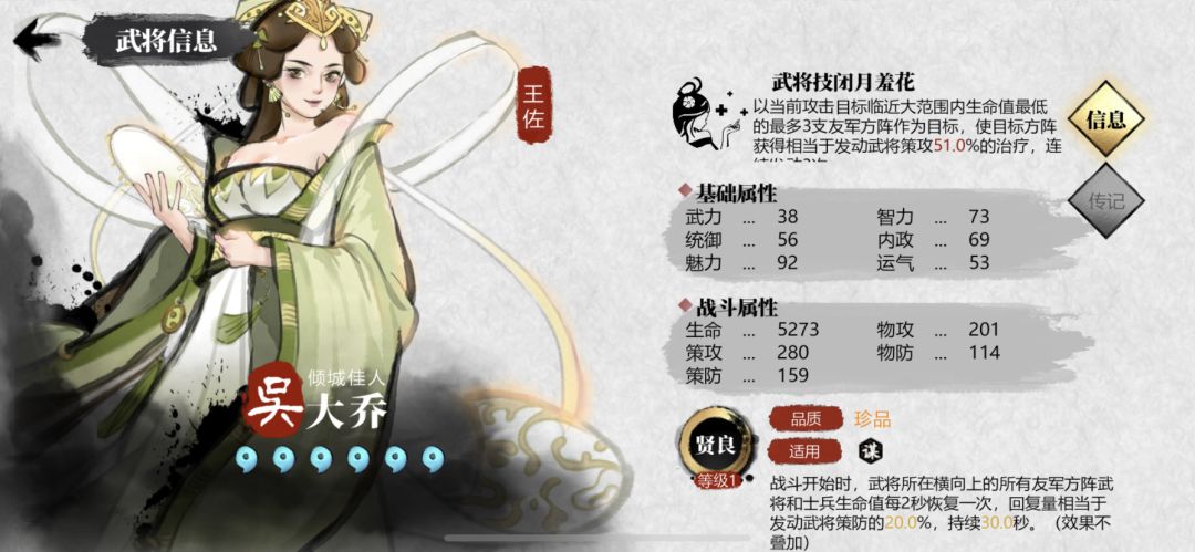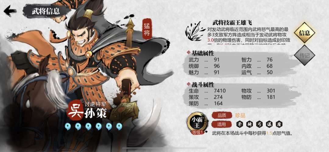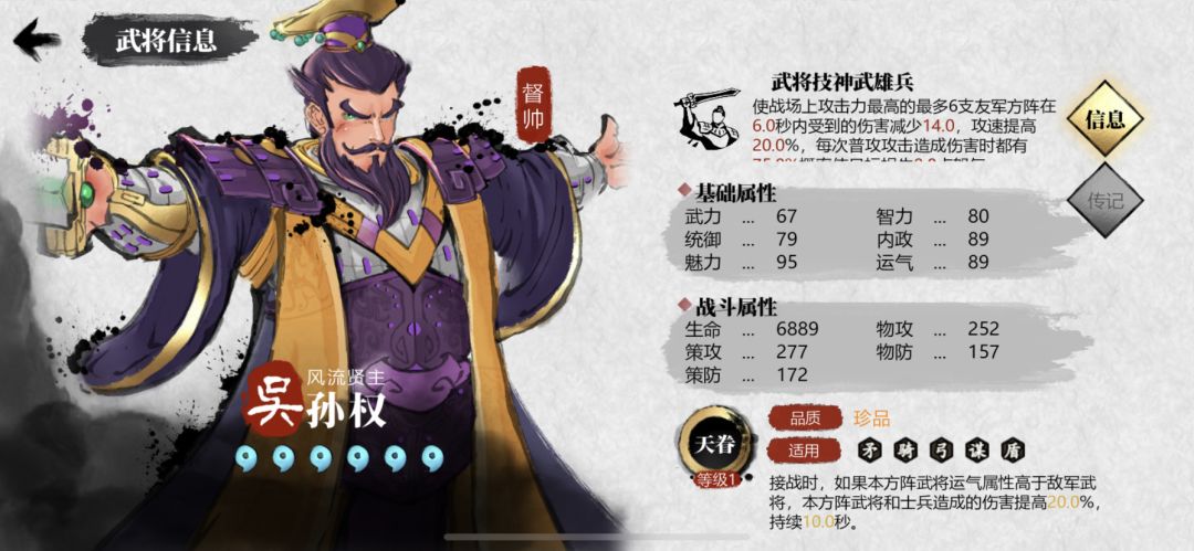 拥有极高的面板,但基本作用是起到“吴国buff”光环的作用,“东吴体系”阵容必带,不然直接缺少较多的光环属性,同蜀国刘备、魏国曹操是一样的光环定位。。