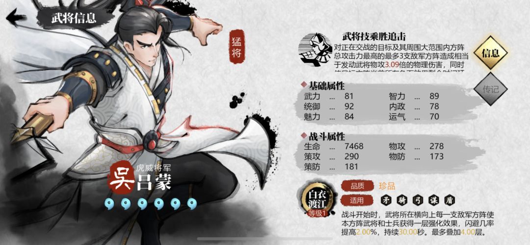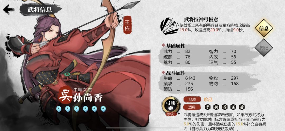 “弓队”组件之一,面板较高,经测试战法后期触发率效果也不错,对一些兵种武将有天然克制。