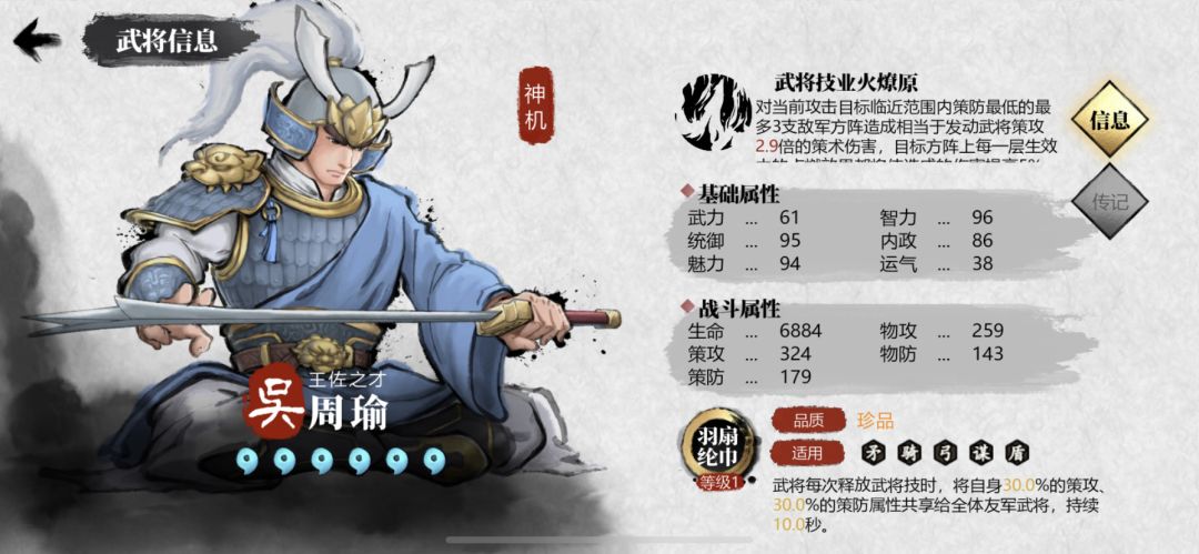 同样是“军师都督队”及“业火燎原”阵容的必备组件,可以看作是吴国双壁,但要和周瑜、及其他谋士搭配才能让策伤输出最大化。