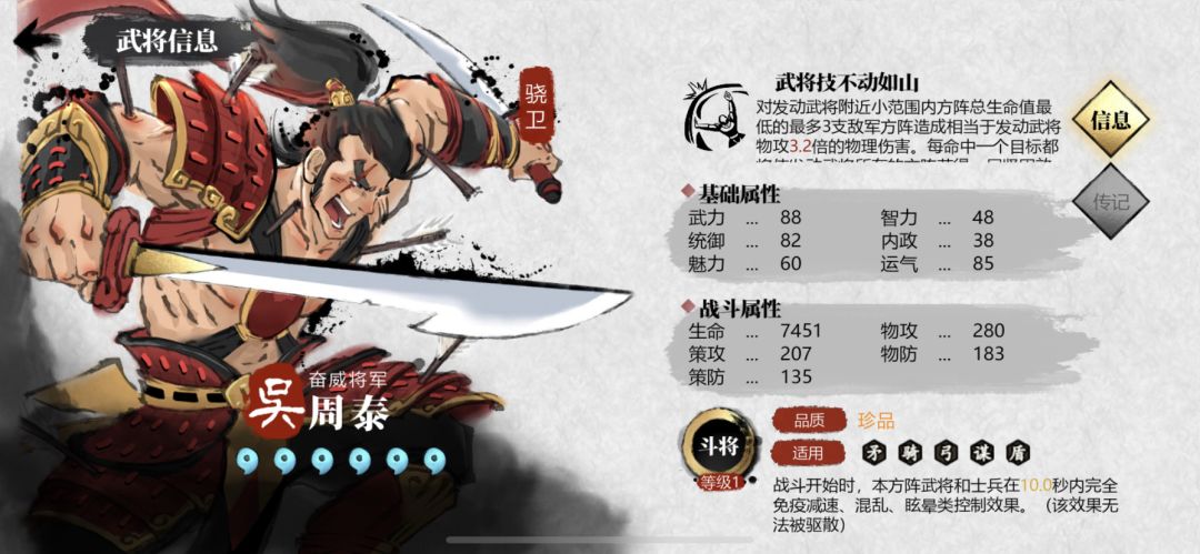 作用等同于黄盖,也是东吴不可多得的优秀大盾,且兼有抵抗buff和致命一击的作用。