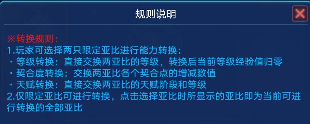 3.不能使用该功能的亚比:除了圣王麒麟之外的所有『大、小晶石宠』均不支持使用转换系统