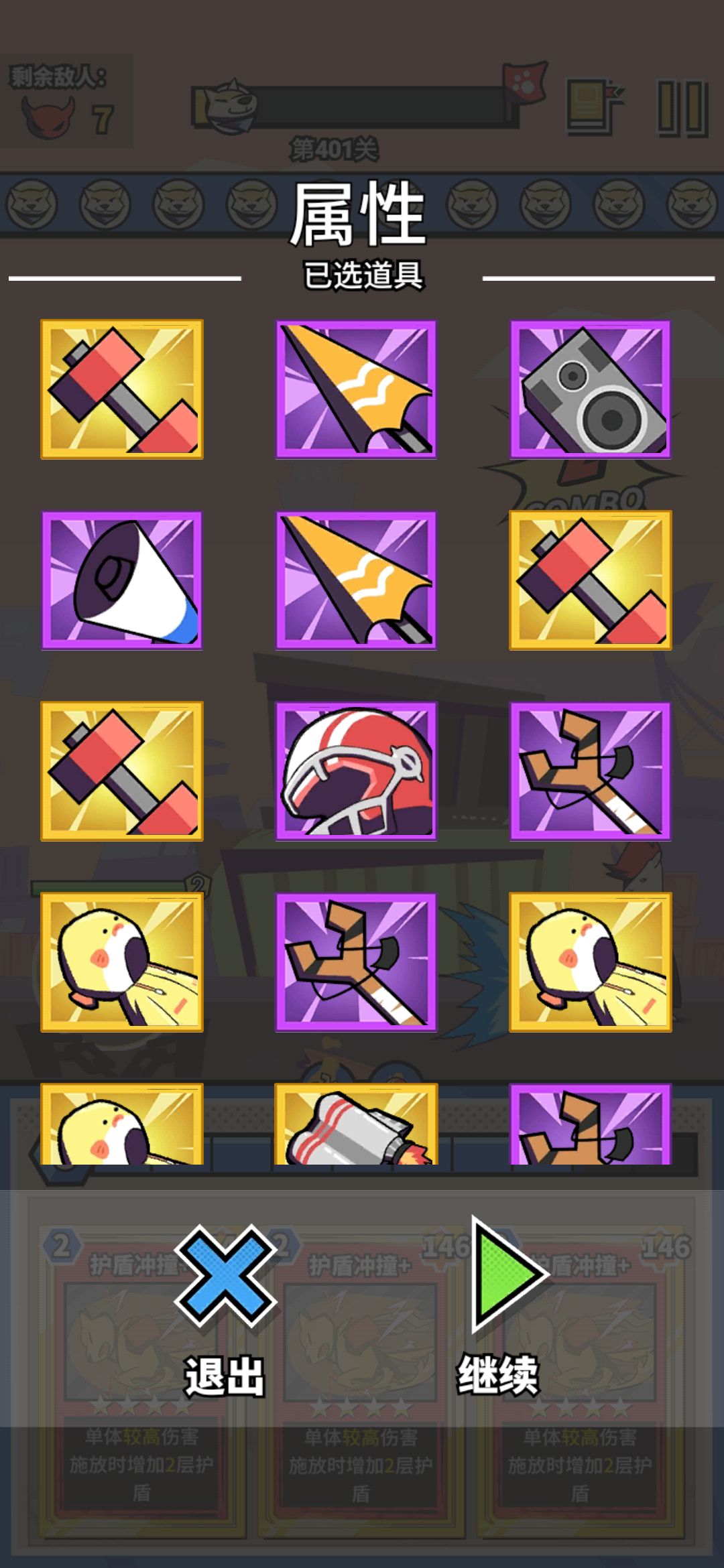 道具:推进器1,雨伞2,雨衣和攻击力大越多越好,喇叭头盔各1,其他的音响,弹弓各种冲击波数量随意