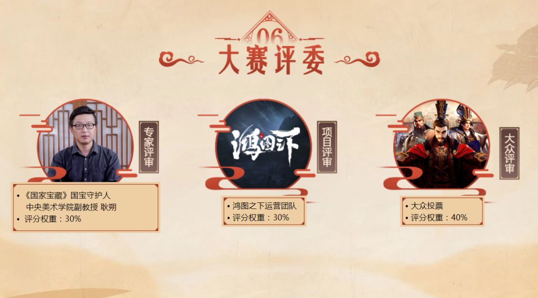 在经过《国家宝藏》国宝守护人耿朔老师将与《鸿图之下》运营团队严格评审后,7月31日赛事将正式进入公示期,榜上有名的优秀参赛作品将于赛事页面集中公示。他们不仅将收获重金奖励,还将在耿朔老师对参赛剧本的严格监修下,见证自己创造的三国世界,将其真正呈现在《鸿图之下》万千三国爱好者面前,供大家征战驰骋!如此殊荣,最终将花落谁家?关注赛事后续进程,7月31日为你揭晓答案!
