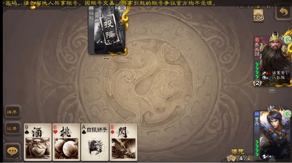 ②动杨彪手牌的,张绣直接用不了牌,神甘宁先看后动稳得一批。