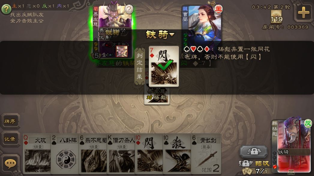 4⃣️杨彪做农民就得刷桃和无邪了,还有一张关键牌———决斗。如果队友没帮你开技能那么你就自己去找递主决斗,他打你你摸牌,他不打你,你赚一血,这也是为了找大点【义争】的卖血,杨彪要么走拉牌差,要么走控制,反正你得占一头。