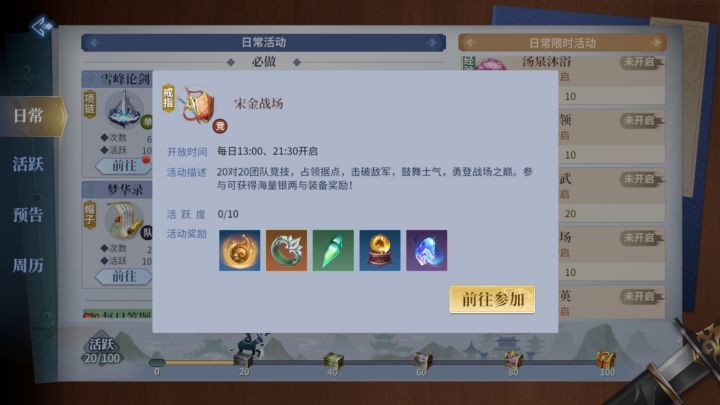 宋金战场是《剑侠世界3》中颇具特色的一项PVP活动。进入宋金战场后,被随机分配到宋方或者金方,与己方其他少侠一起,对抗另一方的少侠。宋金战场每日16:30~17:00、20:30~21:00、22:30~23:00开启,每位少侠每天可免费参加两次。每次参与,均以击败对方阵营NPC或少侠为目的,最终总积分高的一方胜利。个人积分排名越高奖励越好;胜利方在结算个人积分时将增加大量积分。