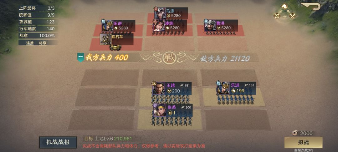 最后是新增了土地拟战功能。在原先侦察土地的基础上,有了一个拟战选项,每块土地每天可以拟战三次,且拟战不会消耗部队兵力和体力。拟战第一次需要两千铜币,第二次需要一万铜币,第三次需要两万铜币,左下角有拟战战报可以查看。拟战功能的出现,大大减少了玩家新手期打地翻车的次数,使玩家节省了大量原用于征兵的资源。 (新手期过后拟战功能消失)