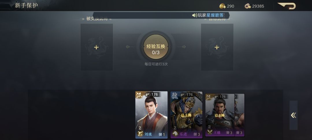 新手期还增加了武将经验互换功能。玩家每天有三次机会选择两个已拥有的武将进行经验和体力互换。(虽然同类型武将也可以互换经验,但体力也会跟着互换,不存在无限刷的可能性,新手期结束后,武将经验互换功能消失)
