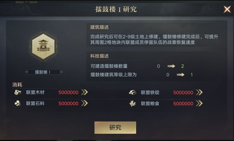 联盟科技中,也增加了可以提升周围两格地块内联盟成员停留队伍的战意恢复速度的建筑擂鼓楼。当然,原先距离越远土地守军越多的设定虽然没了,但现在打远距离土地依然有额外的经验加成,可谓很不错了。而且如今屯田,练兵等遇到通路中断,或我们自己停止屯田,练兵,都会返还政令消耗,而不会像之前一样,只要出发就扣除政令,不管成功与否。