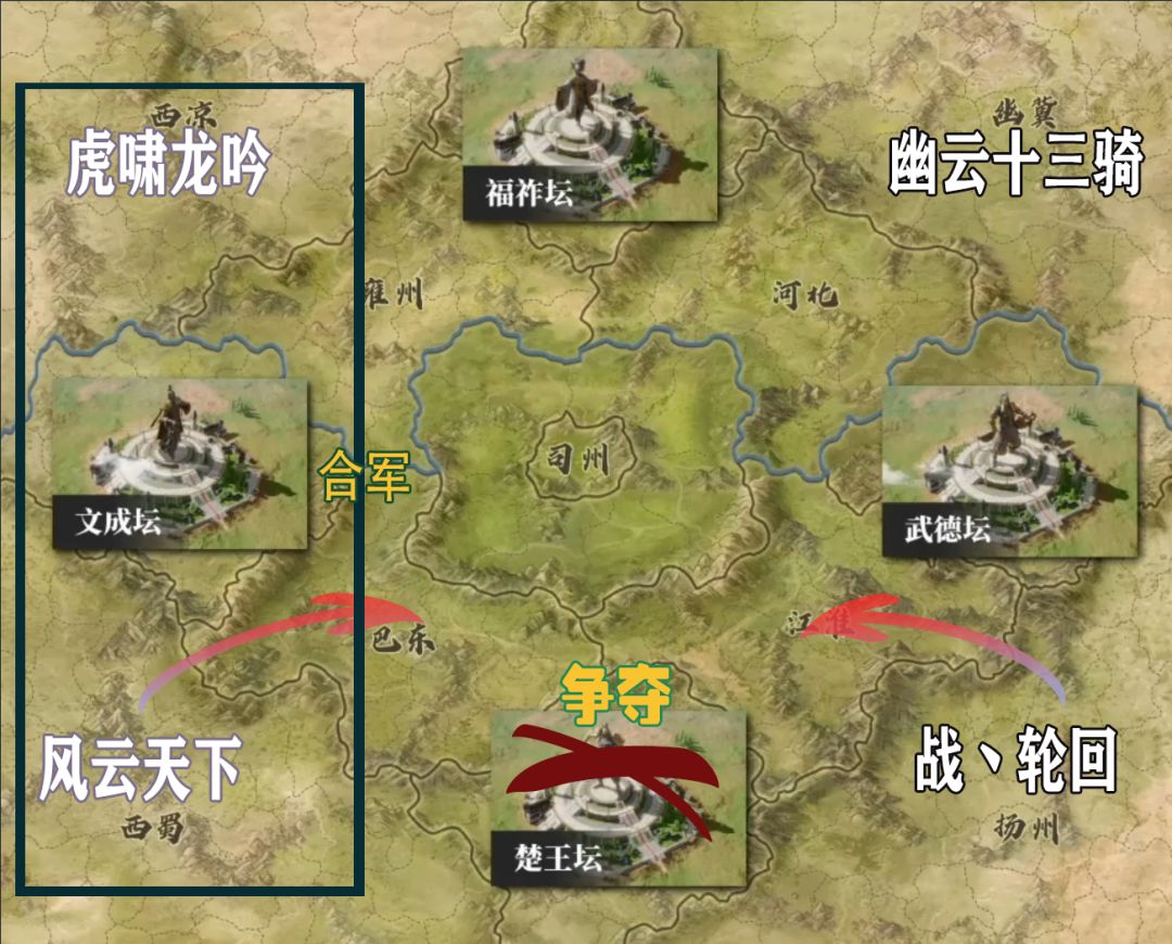 战丶轮回与风云天下分别落州于西蜀、扬州,与之交界的楚王坛会成为双方第一个交战地点。除了争取楚王坛之外,战丶轮回要打通河北接回落州幽冀的兄弟,而风云天下也要打通雍州与虎啸龙吟合流。