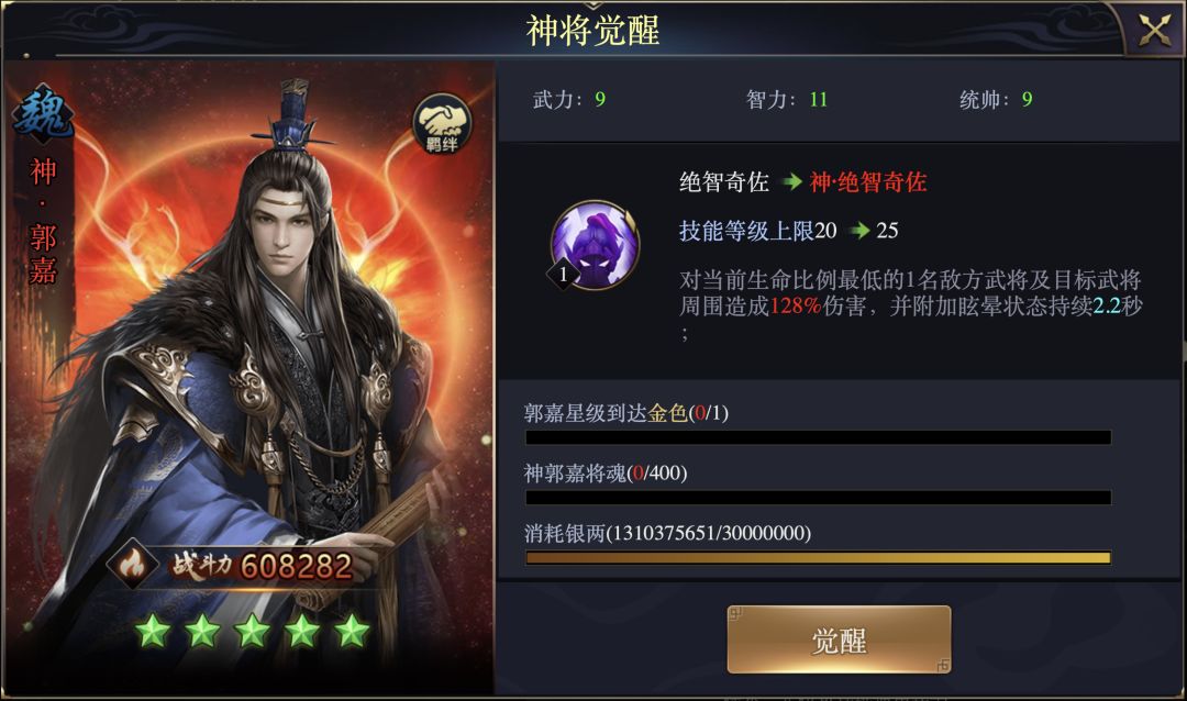 1、郭嘉星级达到金色;2、神郭嘉将魂达到400个;3、消耗银两3千万