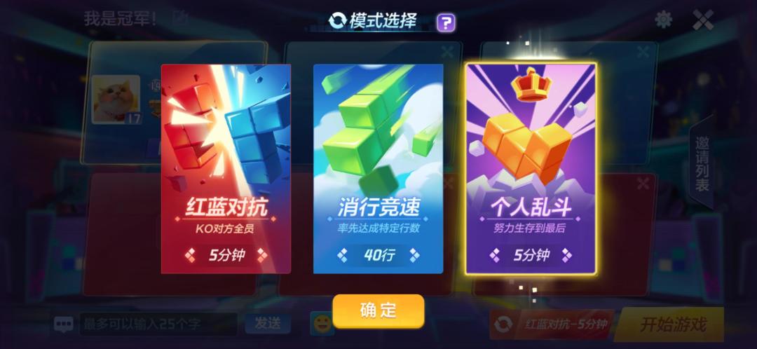 2、消行竞速:多名玩家同时进行比拼,率先消除指定行数的玩家获胜,未达到指定行数的玩家会根据消除行数进行排名。