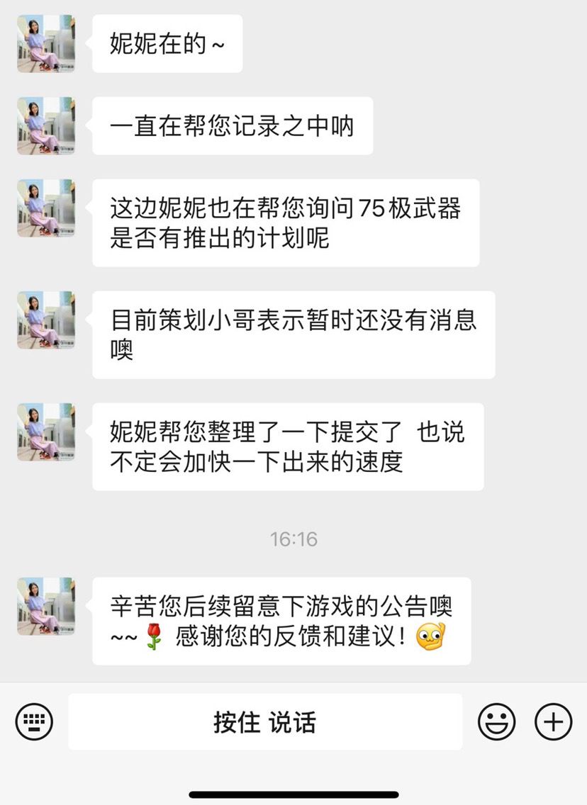 再过不久防具都要毕业了,今天问了一下妮妮,让他帮忙问一下75极武器材料的副本什么时候可以出,结果她这样回了我。唉,现在也没人发帖子了,人多力量大的方式也没用了。策划已经放弃在游戏上花心思了,花钱的方面倒是还不赖。😔😔😔还是怀念原来的老策划,让我这种平民玩家还有玩下去的动力。最后还是祈福:75极武器尽快出把。