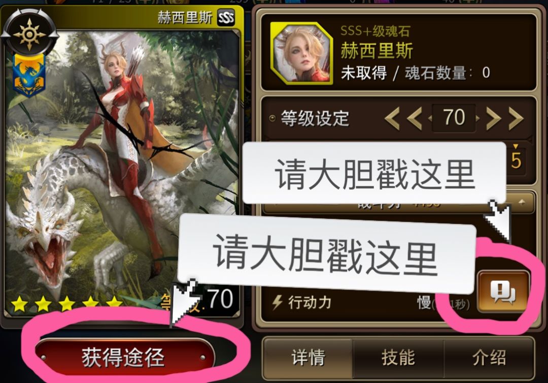 因此,各位喜欢赫西里斯女神的冒险家们,可以通过游戏内评论(下图右下角箭头所示位置)以及本帖下的评论,写下对赫西里斯女神的青睐,使用格式台词+xxxx(台词内容)的形式参与台词征集。我们从中筛选优质评论录用,并会在万魂论坛中公布选用者在万魂世界中的名号!欢迎大家踊跃参加呀!喜欢她想得到她的冒险家们,可以通过点击下图左下角箭头所示位置获取信息从而得到赫西里斯女神的卡牌!