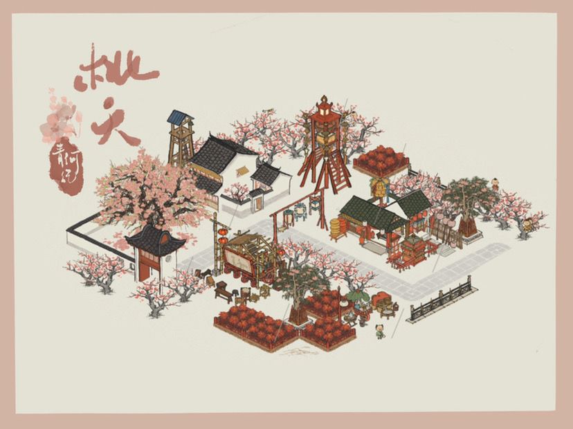 桃夭,以新嫁娘小院为主题的布局。粉色和红色的主题色,恰好周年庆民宅有花灯(现在没有了又回到了桃花)、合欢树、桃花、应天的喜服店都非常应景,还有一台花轿在路边哦
