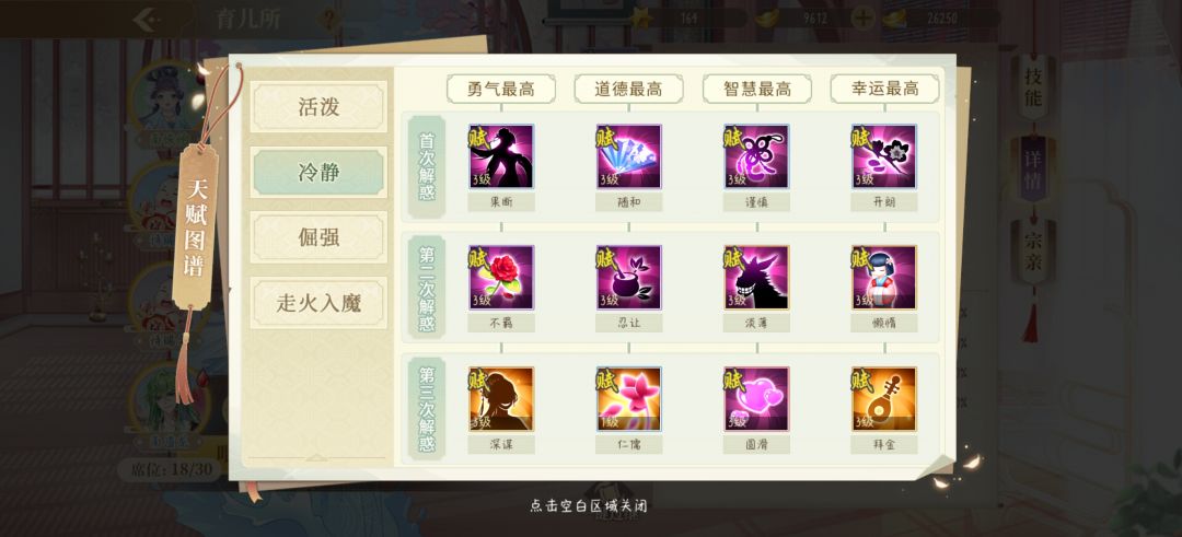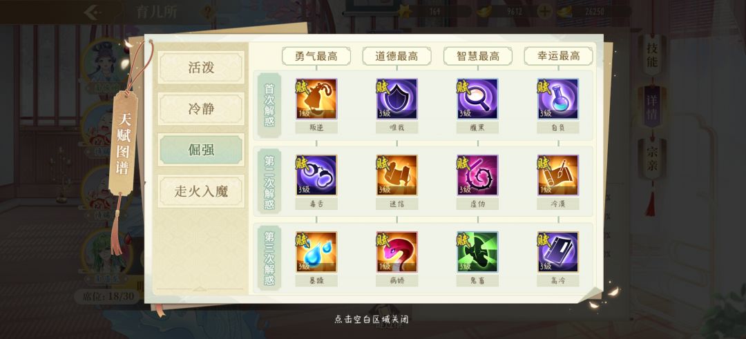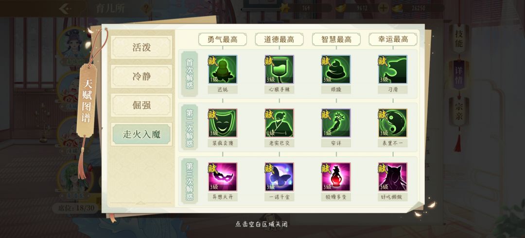 6.性格/技能:初始性格为活泼、冷静、倔强以及比较特殊的走火入魔。通过培养初始性格可以得到其他性格,每种初始性格对应12种培养后的性格。技能与性格是对应的,具体培养方法可以点击育儿所选秀上面的天赋图谱。崽崽的初始性格来自于父母的性格所对应的初始性格,刚出生的崽只会拥有三种初始性格之一,走火入魔为在培养过程中突然出现的紫色火焰。有一说一瓶中人真的太好看了,yyds。走火入魔是概率发生的,目前貌似没有具体有效的培养方式。