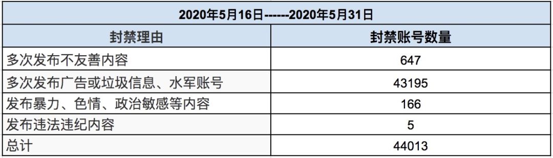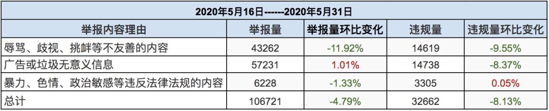 五月后两周社区总举报量为106721条,同比减少4.79%;实际处理量32662条,同比减少8.13%,同比上举报量均无太大明显波动,数据较为稳定,五月一整月来Taper们的举报也是相当积极,但本期举报核实处理率继续下跌,降至30.61%,小管家希望小伙伴们在积极举报的同时也要理性考虑被举报内容是否真正违规哦~