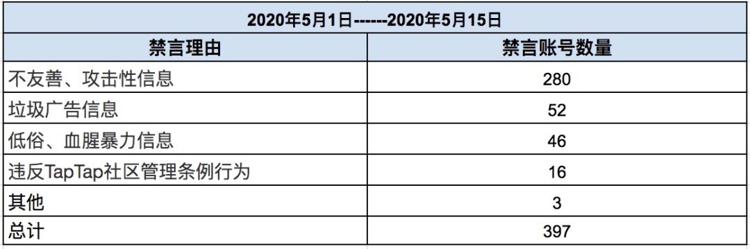 五月下半月禁言总量397,同期有近10%的增长,相比上期因”发布不友善、攻击性信息“而被禁言的账号数量持续增长,近期不少热门游戏上线,希望Taper们在激烈讨论时一直要和谐措辞,友善交流;