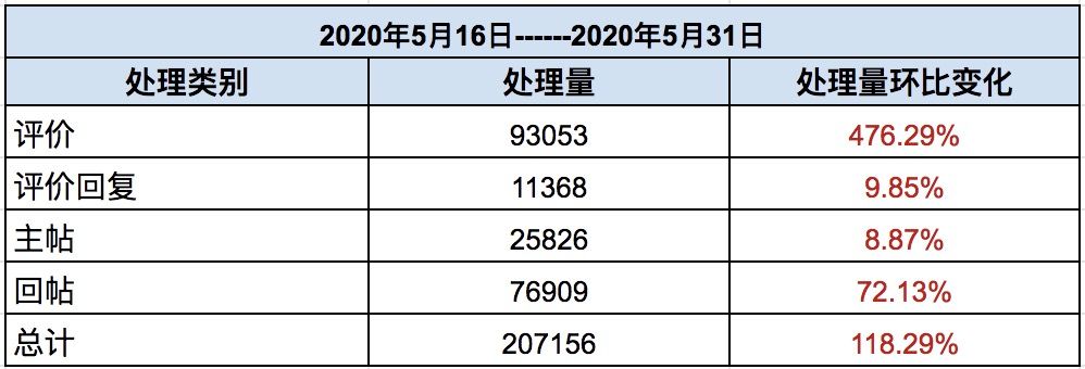 五月下半月内容处理量为207156条,平均每日处理内容13810.4条,本期处理量的大幅增长来源于下半月对于水军账号的大批量处理,相比于上期,五月下半月评价处理量增长476.29%,其中大部分都是虚假的水军评价~