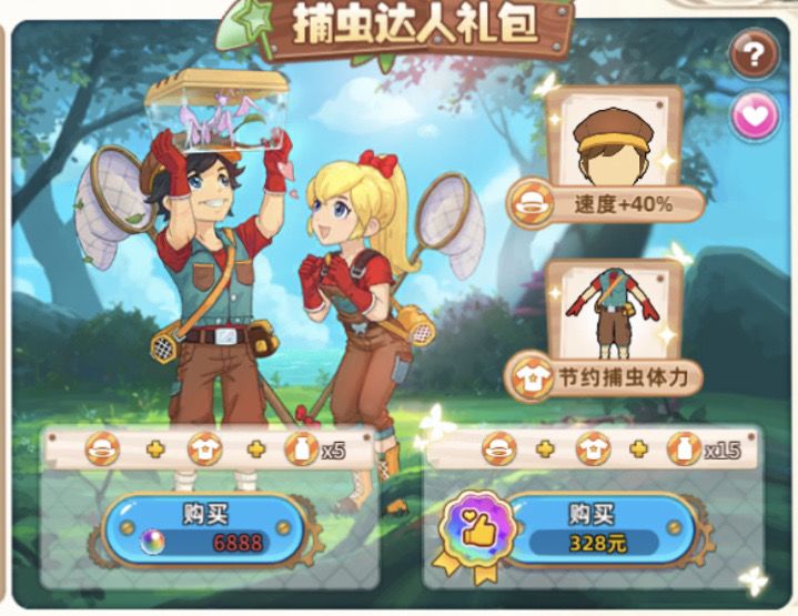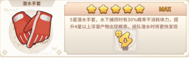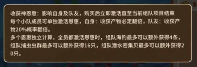工具分别是矿镐、鱼竿、捕虫网和潜水手套(四个挂机工具);营养餐是之前一期的岛主奖励(后面可能会返场);矿天赋是天赋第二列最后一个天赋(增加矿产量);大鱼套是清凉钓鱼套装(鱼上钩速度更快增加助力次数);恩惠是100珍珠一次的(不怎么充值珍珠的萌新不建议开);手稳就是捕虫摸贝不miss,因为一人失误全队遭殃(刚开始可以自己在岛上练练)