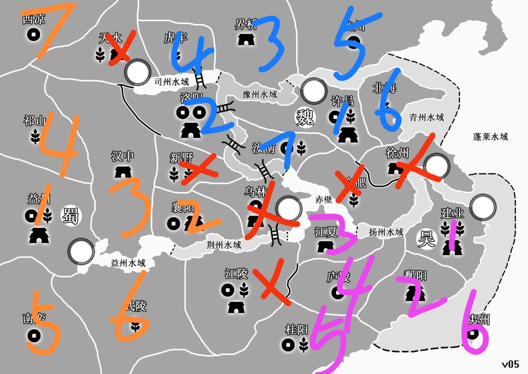 一为在拉扯区夺下3城,再强占1城,如魏夺乌林、徐州、天水,再夺汉中。。。如蜀夺天水、乌林、江陵,再夺界桥或江夏