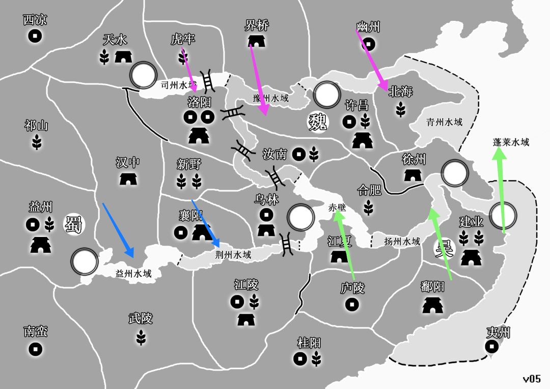 在地图上,你可以看到,魏蜀吴各有两座大城一座小城,共3城。。。拉扯区为天水、乌林、江陵、徐州,四座小城。而魏蜀吴相邻的拉扯区城各有3座。胜利条件有二: