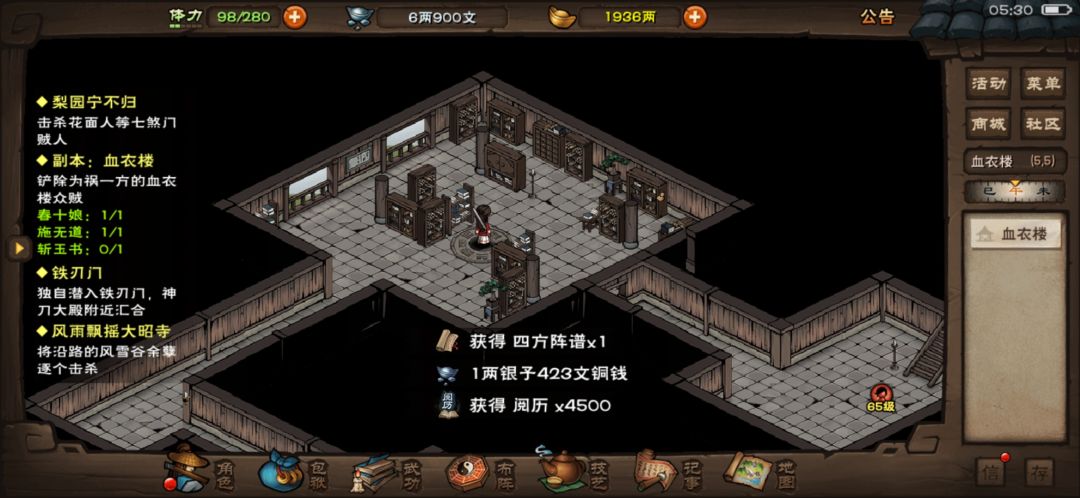 每天三刷血衣楼,种玉诀、血衣剑法、麻痹戒指、白鹿剑、斩玉书的时装全部齐全,然而,最想要的四方阵死活不出……今天又是连刷两次,没有四方阵,没有四方阵,没有!我已然心如死灰,身上已经没有了三刷血衣楼的银两,瞬间感觉没有了玩下去的动力。萌生了退意的我,一咬牙卖掉了包裹里收藏的橙装,攒够了20两银子,最后一次血衣楼,不出就拜拜,退游吧。