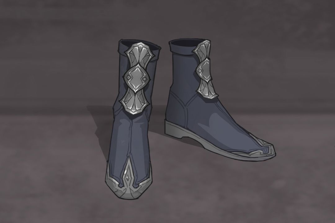 我们再看飞白玉的靴子,设计了与肩甲同系的硬质的包头和硬质靴筒装饰。这样具有实用性的设计,体现了衣服的主人绝非拘于琴棋书画诗酒茶的纨绔之辈,他或许行万里路、或许击剑当歌,总之定有一根硬脊、甚至傲戾山河。
