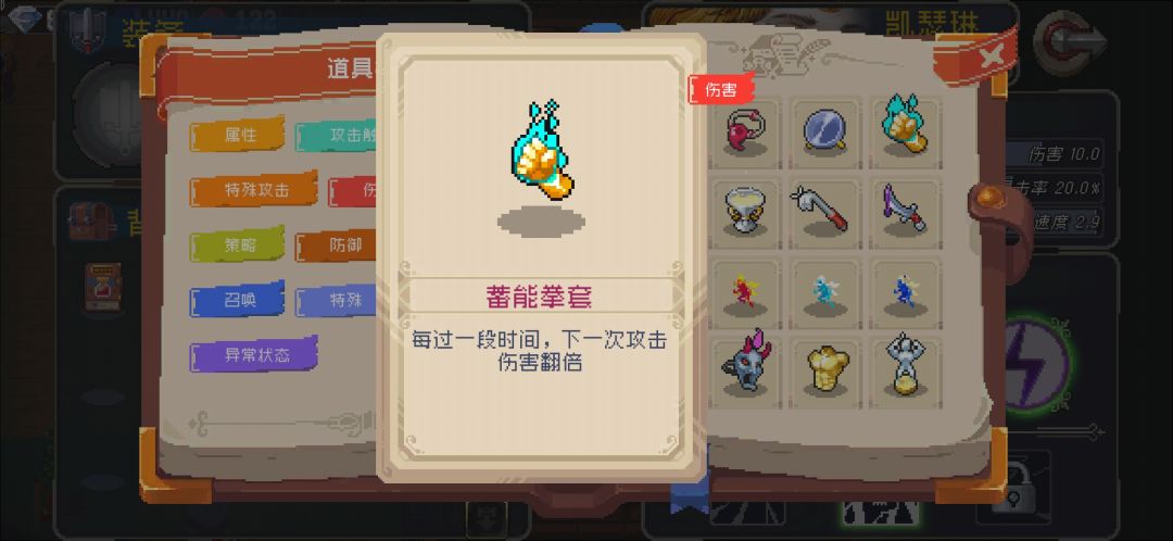 蓄能拳套(蓝拳):每隔4秒会有蓝光特效,此时你攻击敌人会造成双倍伤害(某些特效流装备会消耗掉)