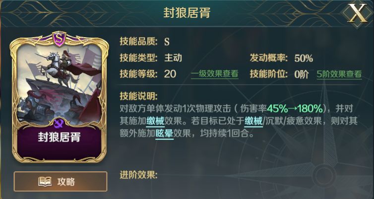 封狼居胥是一个单体物理伤害控制技能,有50%的高发动概率,还附带一定的伤害与强大的控制效果,是一项非常全面的技能。