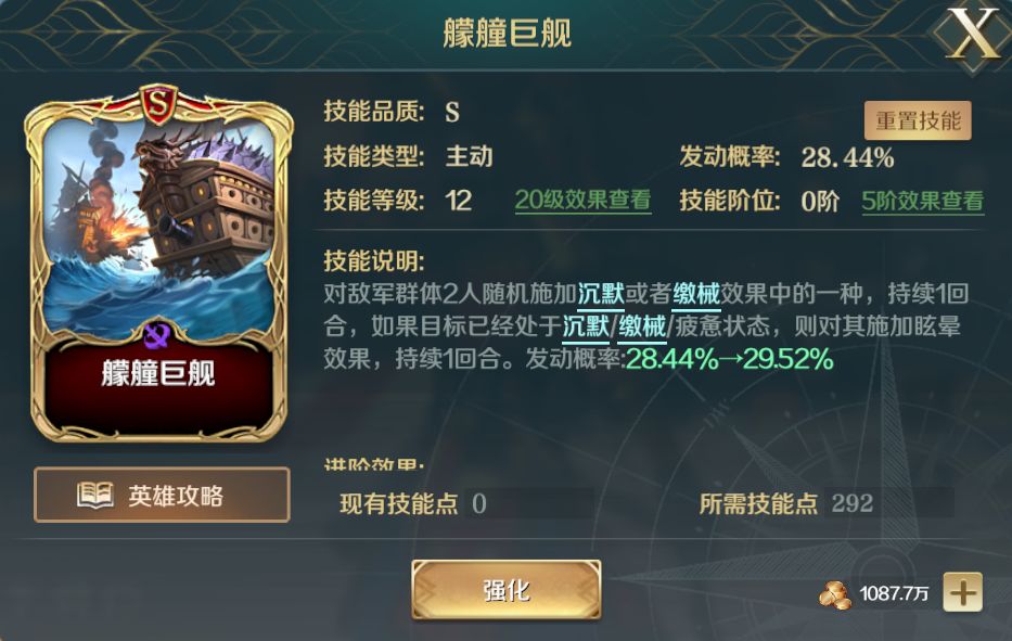 以李舜臣为例,他的主动技能是【艋艟巨舰】,效果与【封狼居胥】非常相似,具体效果如下: