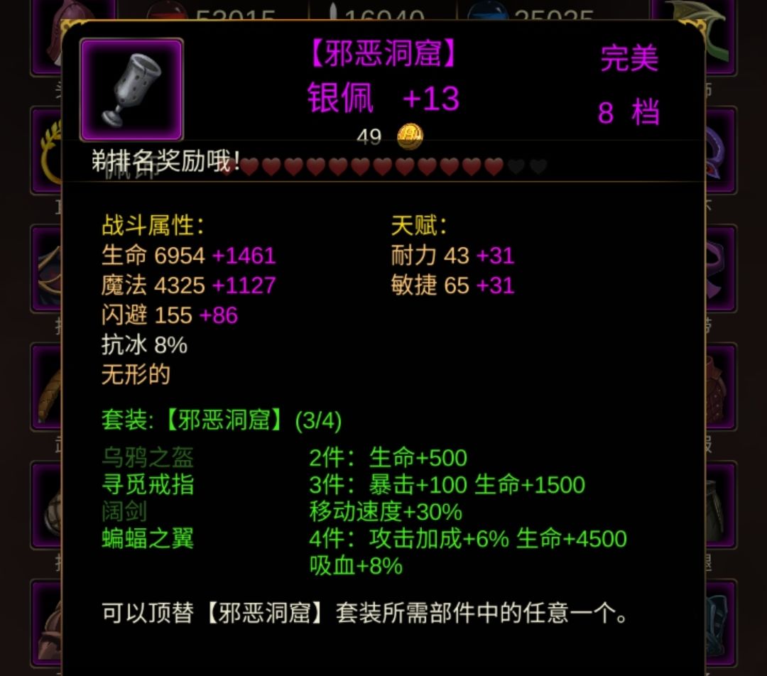 作为刺客,我首先集齐了,套装邪恶洞窟和无休止套,邪恶套提供大量血量,无休止套提供攻击,当然前期装备孔尽量都镶嵌物攻符文,主堆攻击力。
