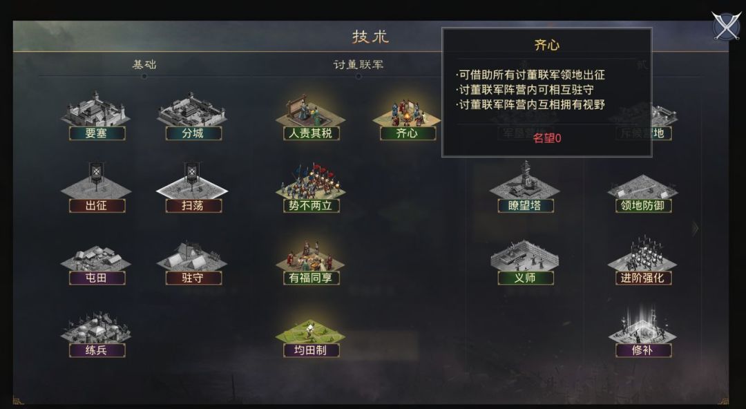 在另一个剧本《群雄讨董》中,玩家可以选择挑战董卓或是加入董卓势力。根据阵营选择的不同,玩家还会获得效果各异的阵营技术。董卓军地盘拥挤、发育困难,“封邑”技术能够帮助其在前期获得更多资源;讨董联军实力较弱但人数众多,可以借助“齐心”互相驻守互相支撑。