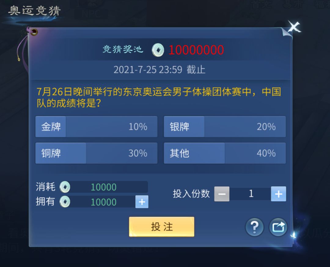 奥运活动期间,每周三界都会开启一项本周最热门的体育赛事有奖竞猜,投入银两即可参与其中,押得越多赚得越多。
