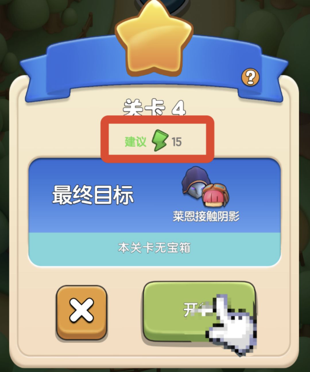 2、进入关卡时需要带一部分体力进入关卡,如图需要15体力(汉斯猜你在看马赛克