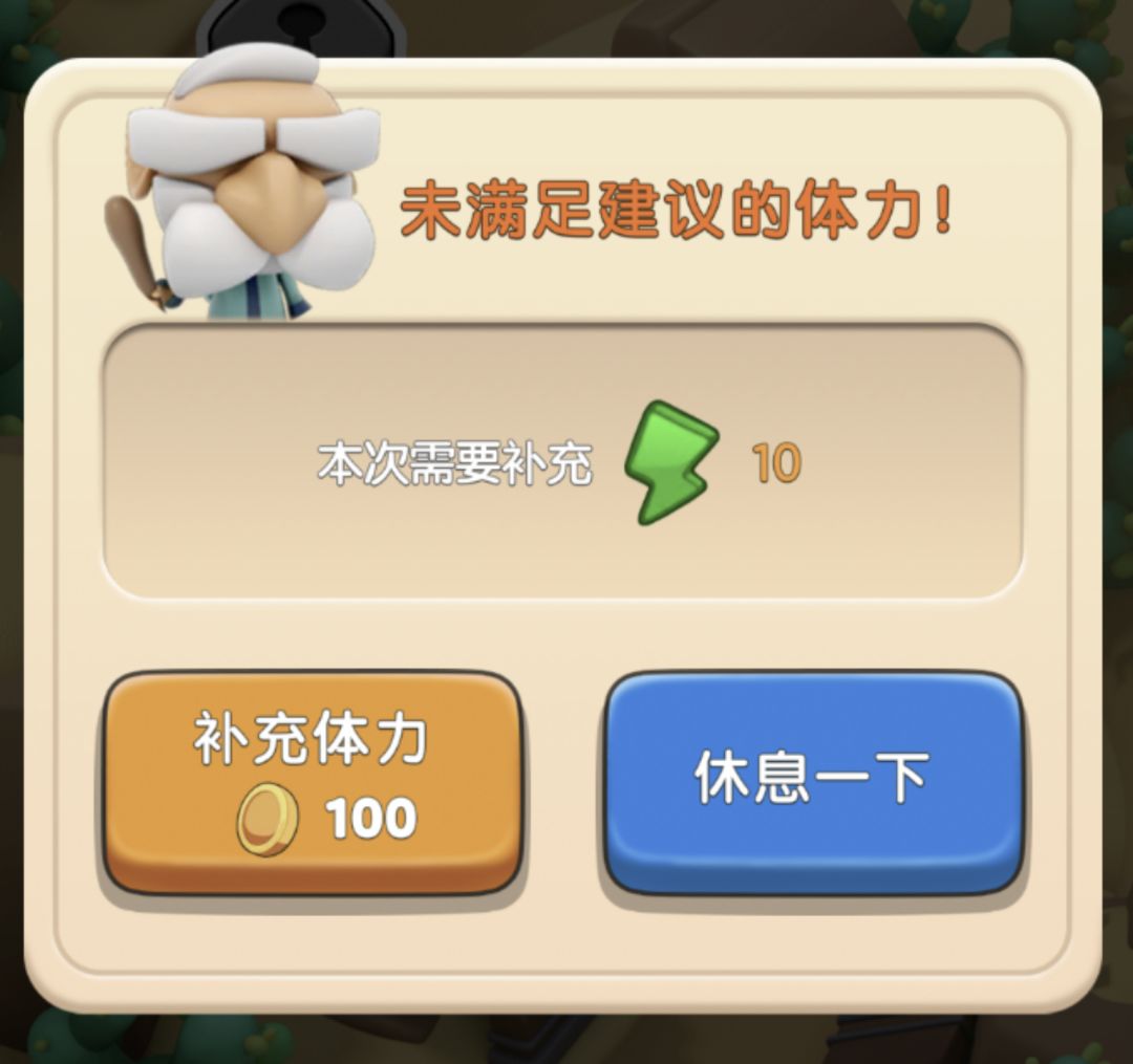 5、当剩余的总体力值低于进入关卡的推荐体力值时,游戏会弹出提醒,进入需要补足体力,否则需要等待体力充足后才可进入