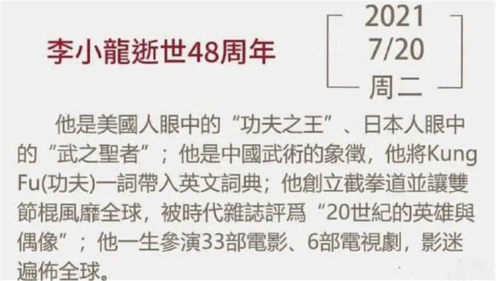 今年的7月20日是李小龙逝世48周年。他让全世界知道了中国的武术,他将“Kung Fu”一词带入英文词典。他的一生虽然只有短暂的32年,但是他的传奇事迹成为了永恒,影响了一代又一代人。