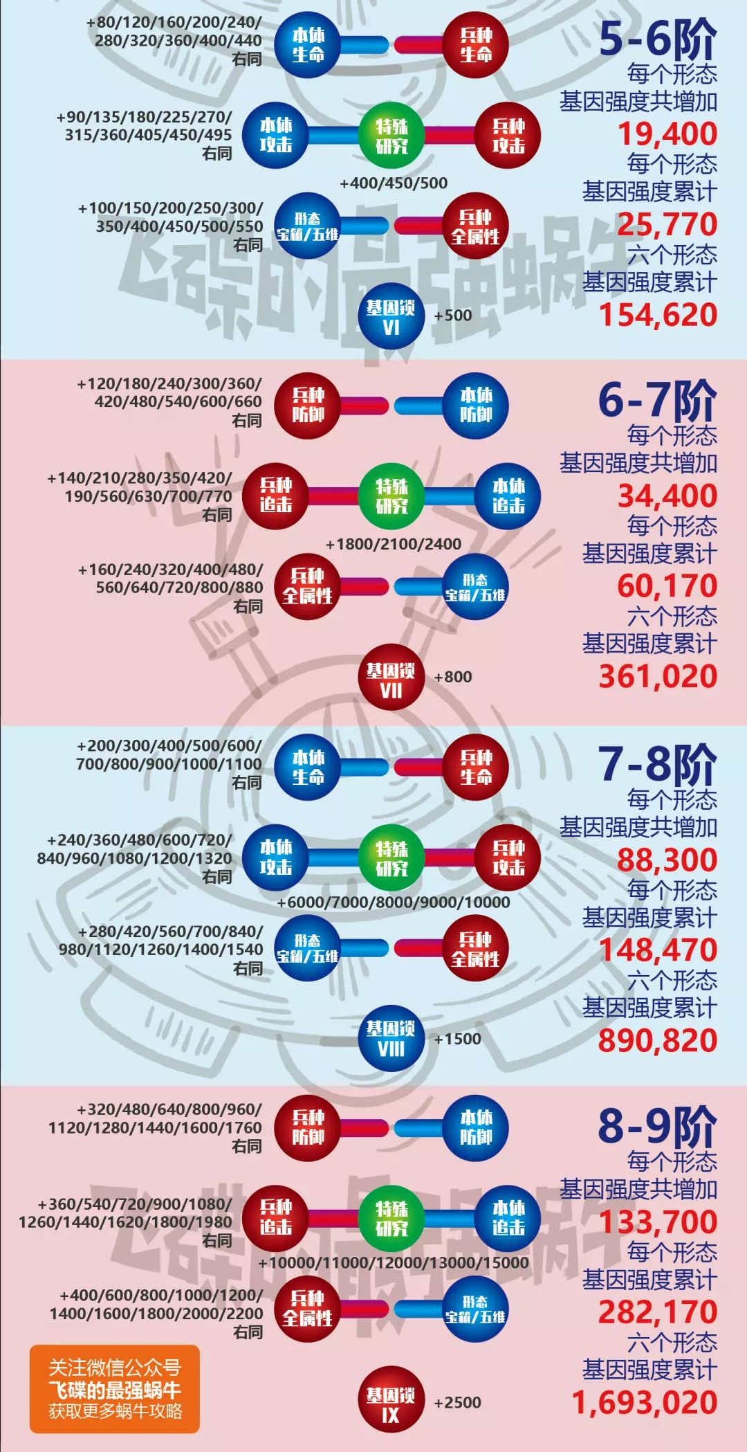 关于基因强度的来源,目前唯一来源是基因研究等级提升,经过统计,每一级基因研究及对应的基因强度数量如以下图表所示。目前仅统计到了1~8阶基因所对应的基因强度值,对于6种形态数值完全一样,对于除基因锁和中间一格的特殊研究之外,每一阶基因左右各三个格子数值对称。