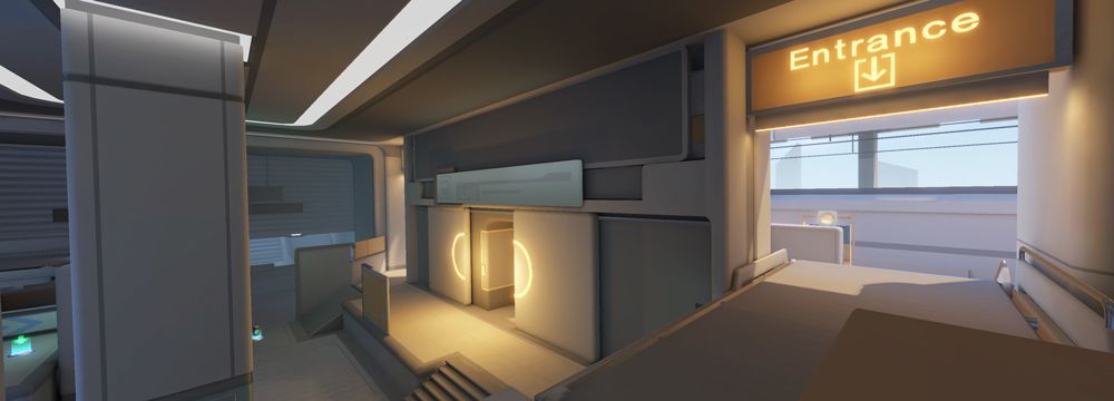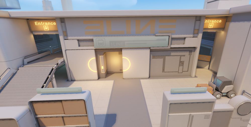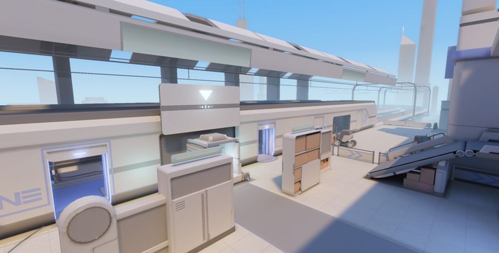 我们将双方的出生点设计成列车的内部,往外走便是站台,中心则是中转大厅,周围随处可见一些装载箱、铝带,容易联系现实去理解这个场景,也能突出T3的特色。想一想,是不是这些货物运输的元素也和「速运中心」有些联系呢?