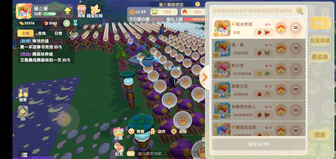 清了下好友,谈下感受吧,从99好友把超过三天没上的清了一下,还剩30多个,之前就说,这游戏就属于半成品,没有明确的方向,大而全,玩家肝,而且基本没有什么实质性的目标,确实是注重社交的游戏,很肝就不是很合理,当然最近剧情已经结束,每天也就做做日常,钓几百条鱼,砍砍树,做做SMC任务,采集浆果之类的,轻松了一些,但感觉过程还是冗余复杂,看得出来是想还原原来的摩尔的味道,但是一些可以省略掉的东西就应该果断舍弃,像服装问题,现在衣服感觉几乎是没有存在感的,因为一天至少为了造成任务就要多次换服装,做完再还回来,因为这些一点一滴的琐事,就使得整个游戏变得逐渐冗余,繁杂。
