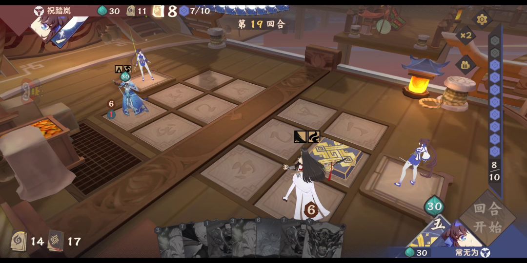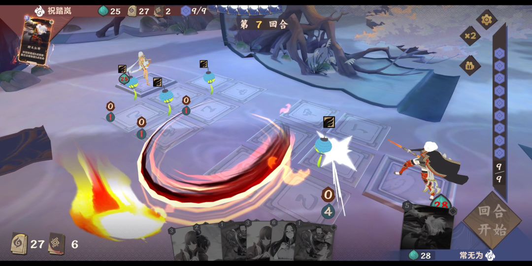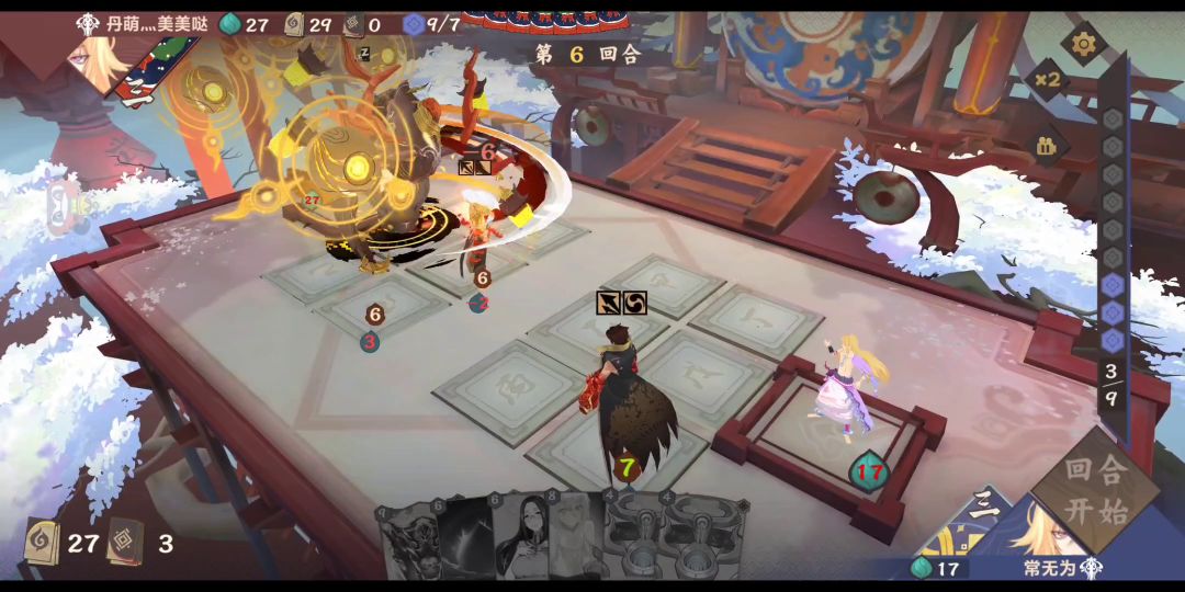 这个在上一期走近九野苍狩洞见师结算顺序上提到过,这次详细讲一下并补个视频,具体操作是5号位打【山中修行】然后6号位法术指5号位,尽管6号位结算的时候5号位是部署,但还是buff不了。原因大概是布阵按下确定时,系统判定buff指向的是【山中修行】这张牌,然后这牌不是部署就失效了(强行解释一波),同样的把【山中修行】换成复活木或者幽莲的大招也是不行的,但是如果把法术指向4号位就可以,因为4号位是空格不是盖牌,而这种情况只有自己法术指向自己盖牌时才会发生,对方法术指过来是可以的,视频中我的法术就成功打中了
