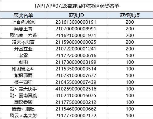 恭喜以下主公获得活动奖励,奖励会在7个工作日内发布到游戏ID邮箱内,请注意查收