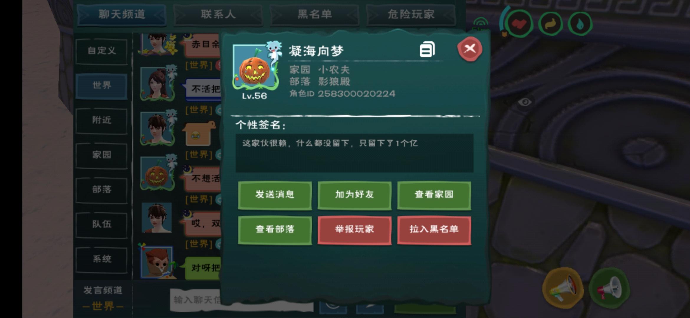 我想知道如果别人真的跳楼自杀了怎么办。为啥这个游戏里面世界聊天这么恶心啊,半夜全是一堆男的在那里聊色情。举报涉黄涉政都没用。白天就是各种劝人跳楼。明明很多人玩,咋就没人管啊。