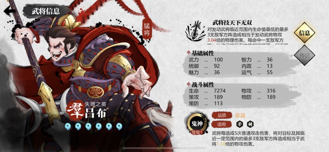 一流的骑兵武将,骑兵光环队的大核心,唯一缺点就是面板偏低。