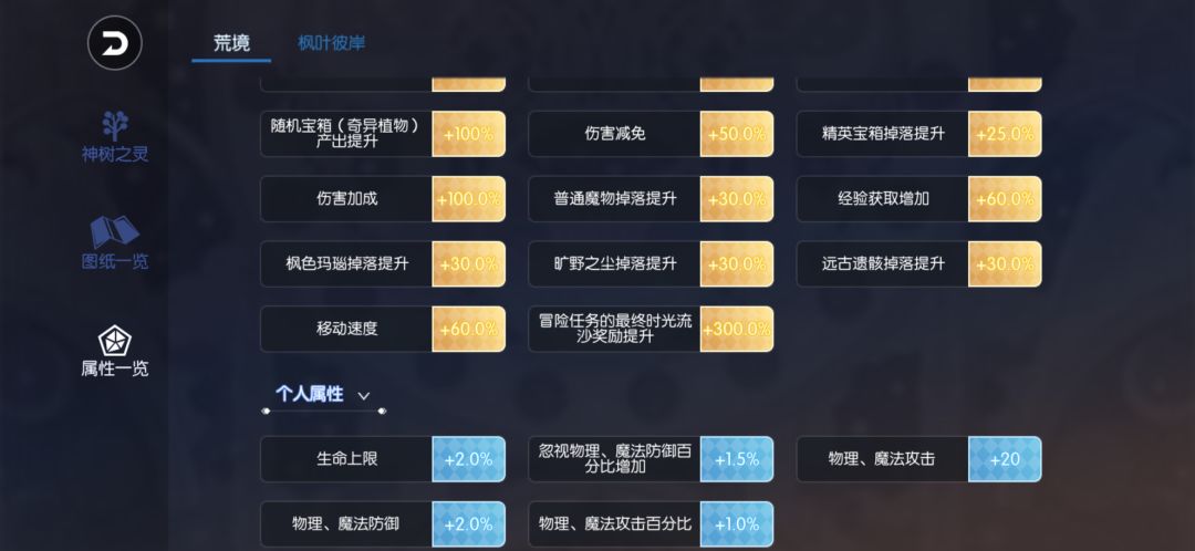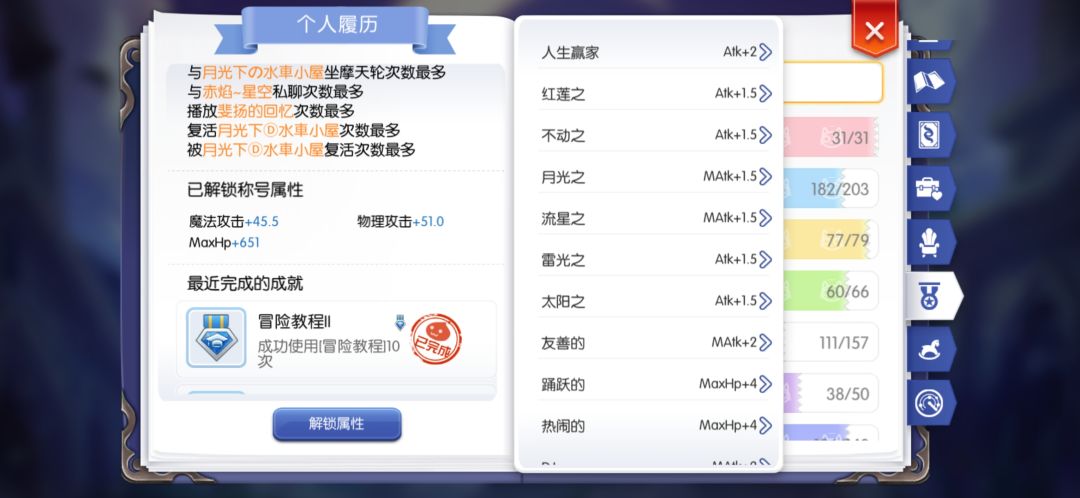 打开冒险手册,完成各种任务,条件,得到部份成就会加魔攻,物攻等等