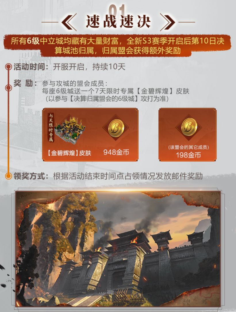 4、 攻下城池后,若出生洲有其他敌对同盟,建议在结算前一天停止攻城活动,警惕敌人偷袭归属城池。