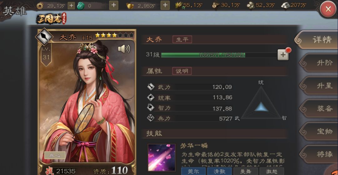 一个游戏的最基本的要素一定是武将,那么怎么样使自己的资源最大化,使武将的配置、战力达到最优解,这是每一个新手玩家该注意的问题,所以在这里首先怀恩先讲一下自己的小心得。每一个武将界面对于新手玩家来说可供操作培养的部分只有四处,那么第一处就是武将的等级,通过点击详情界面可以看到武将目前的等级,那么有的小伙伴就要问了这个有什么好讲的,等级越高越好喽,确实如此。但是有一个问题就要出现了,我们知道一个队伍总共有六个武将构成,而一个新手的经验书是有限的,我们到底是要主攻一个将领培养还是雨露均沾呢?这里怀恩给大家一个小建议,那就是先把一个主武将升级到三十级,剩下的资源再供第二个、第三个、以此类推,不要平衡升级。